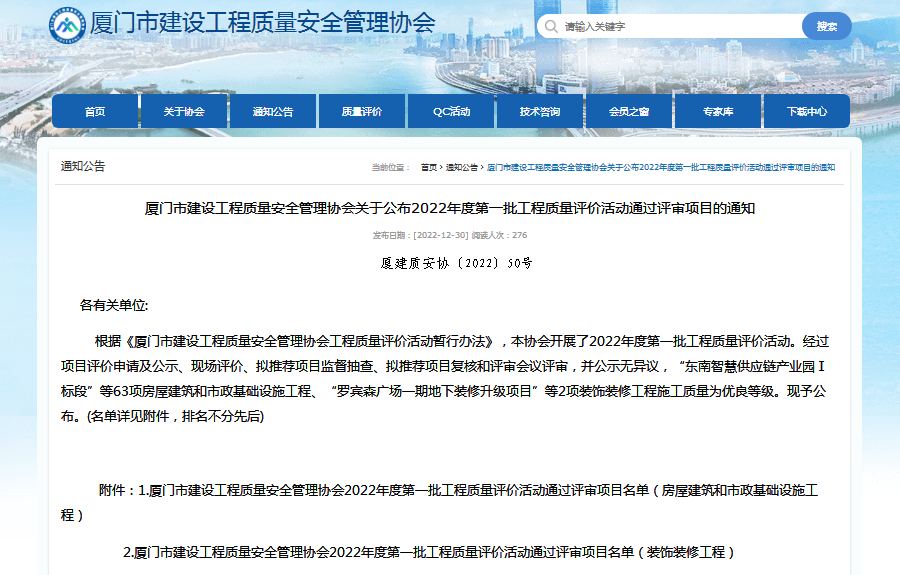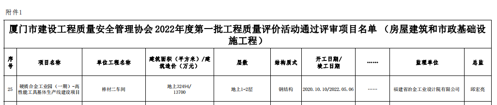 福建省冶金工业设计院有限公司承接负责监理的厦门金鹭硬质合金有限公司硬质合金工业园(一期)—高性能工具基体生产线建设项目—棒材二车间工程项目,被厦门市建设工程质量安全管理协会评为2022年度工程质量优良等级。