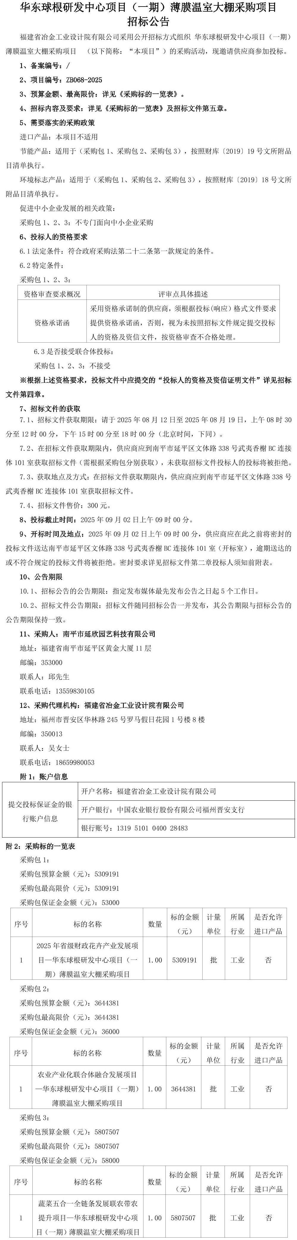 华东球根研发中心项目(一期)薄膜温室大棚采购项目 招标公告